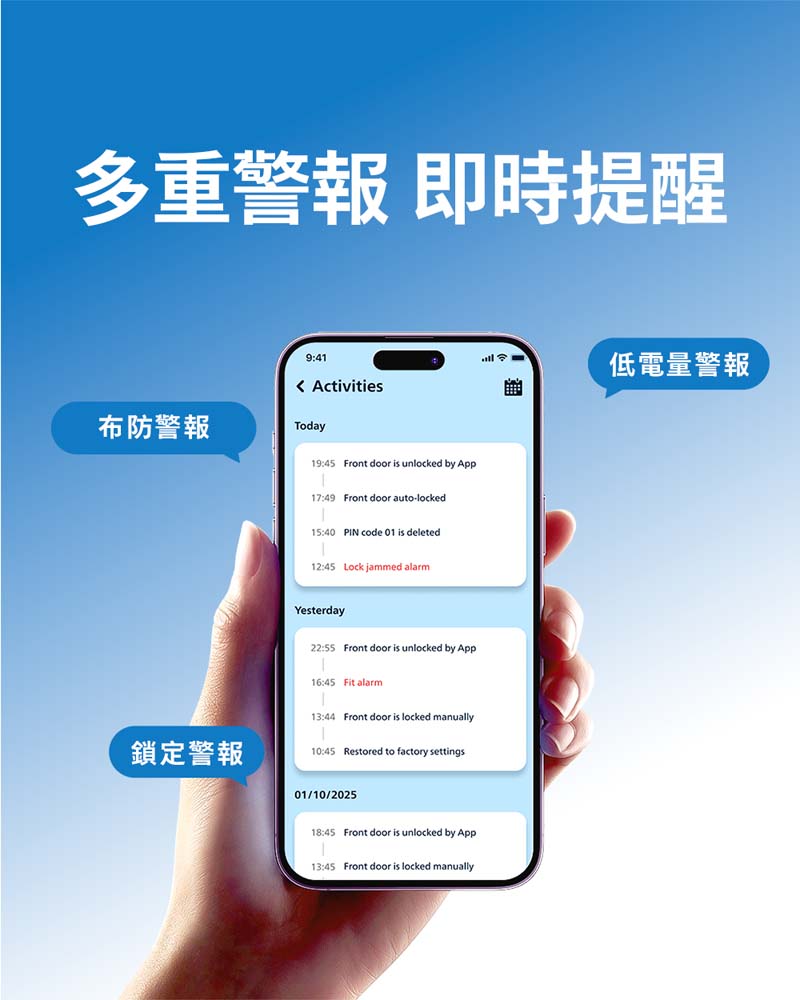 重點功能:防拆警報/外部強制鎖定警報/低電量警報/鎖舌異常警報/系統鎖定警報