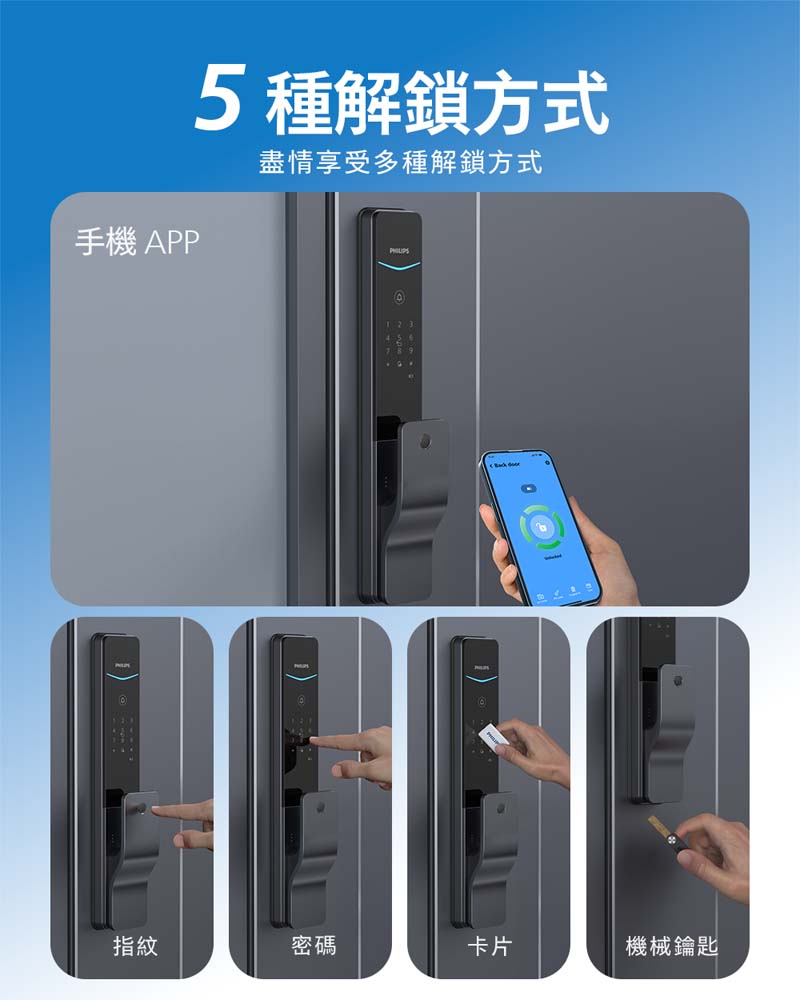 室外開門:指紋/密碼/卡片/臨時密碼/機械鑰匙