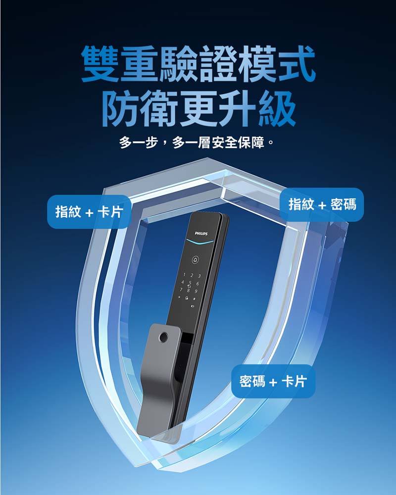 在雙重驗證模式下,您可以使用指紋、密碼和卡片三種解鎖方式中的任兩種進行識別驗證,