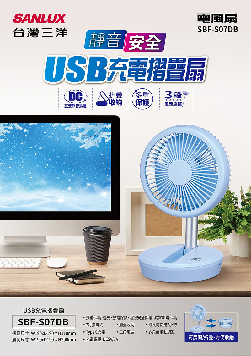>SANLUX台灣三洋 7吋 DC直流USB充電摺疊扇 /台 SBF-S07DB