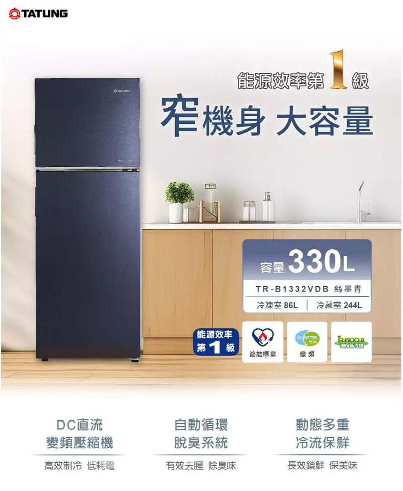>TATUNG大同 330L一級能效變頻雙門冰箱 墨青 /台 TR-B1332VDB