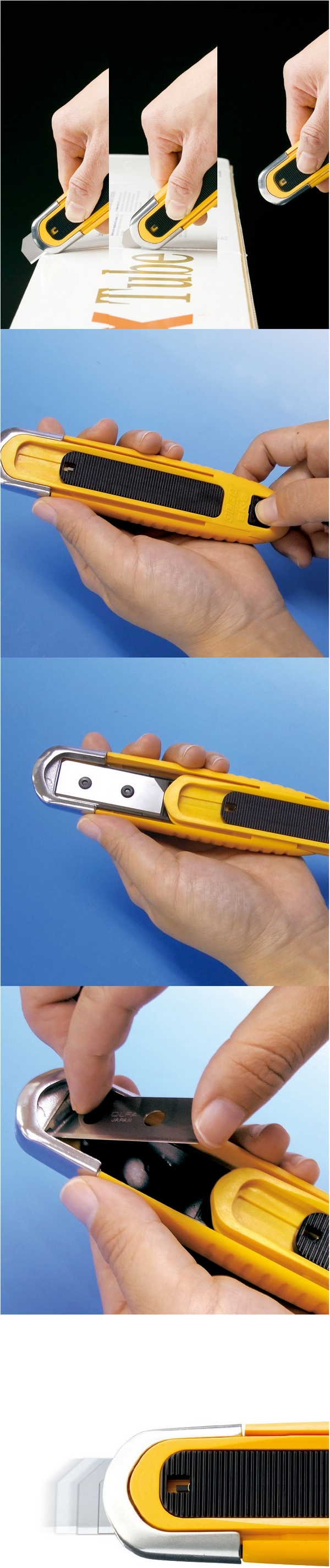 與以往安全工刀最大的差異,為刀片在脫離切割之紙板後,即會自動縮回刀柄內,即使操作者的手仍然按住刀把上之滑板。