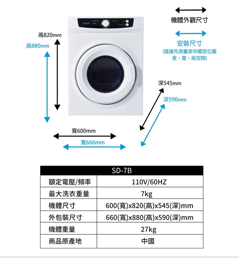 >SAMPO聲寶 7公斤乾衣機 /台 SD-7B