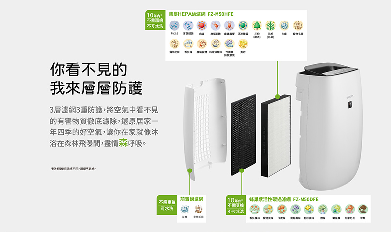 HEPA過濾網(型號,壽命):〇,FZ-M50HFE(壽命10年)*濾網配件視使用環境不同可能需提早更換