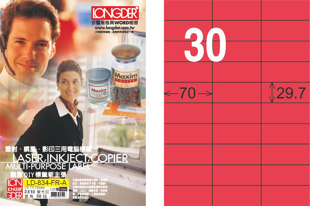 商品名稱:龍德 LD-834-FR-A A4雷射影印標籤 螢光紅 / 盒