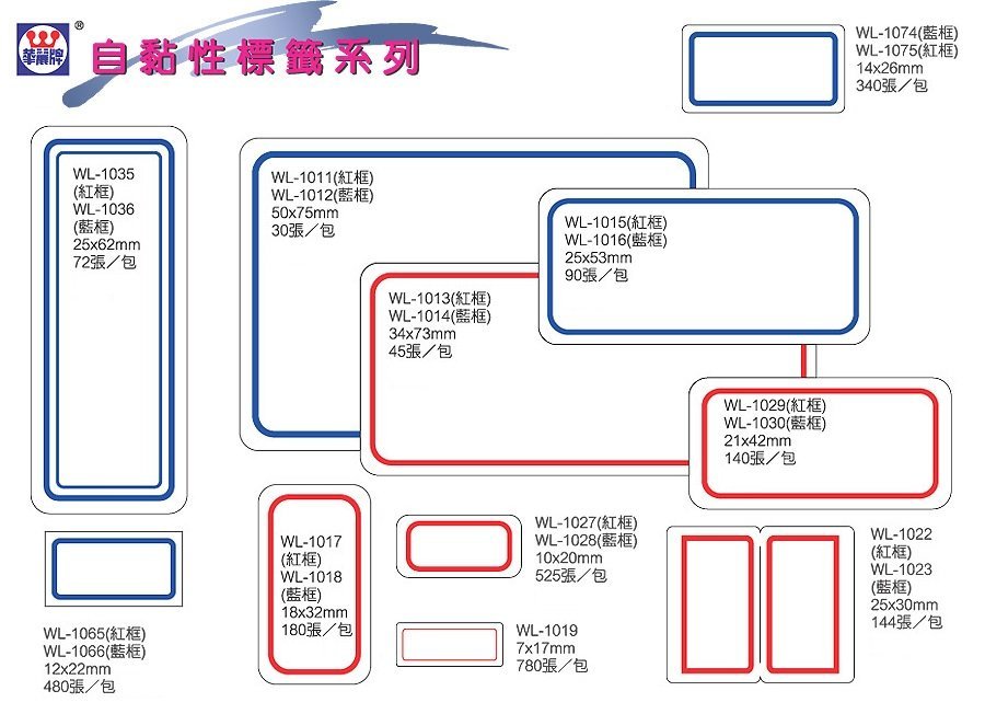 商品名稱:WL-1012自黏標籤紙 (50x75mm) 30張/包商品單位:包商品型號:WL-1012商品特色:白底藍框 適用黏貼在紙張或塑膠表面 文件檔案夾/索引/商品標示/規格/分類等各種標示黏貼之用