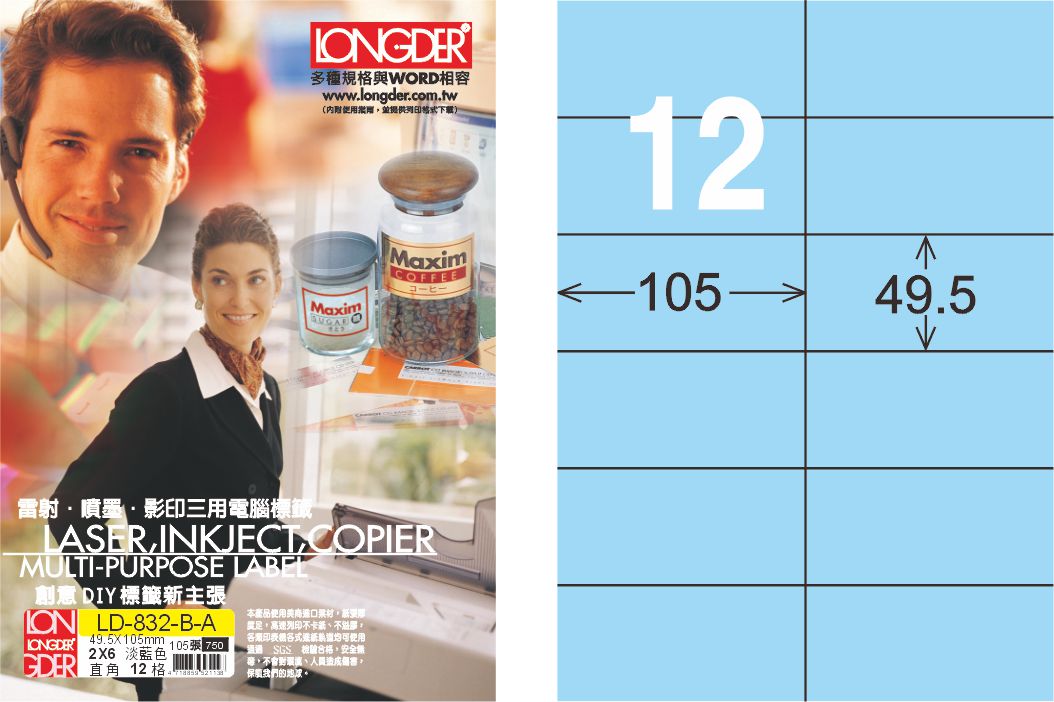 商品名稱:龍德 LD-832-B-A A4三用電腦標籤 淺藍色 / 盒