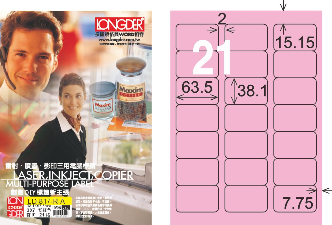 商品名稱:龍德 LD-817-R-A A4三用電腦標籤 粉紅色 / 盒
