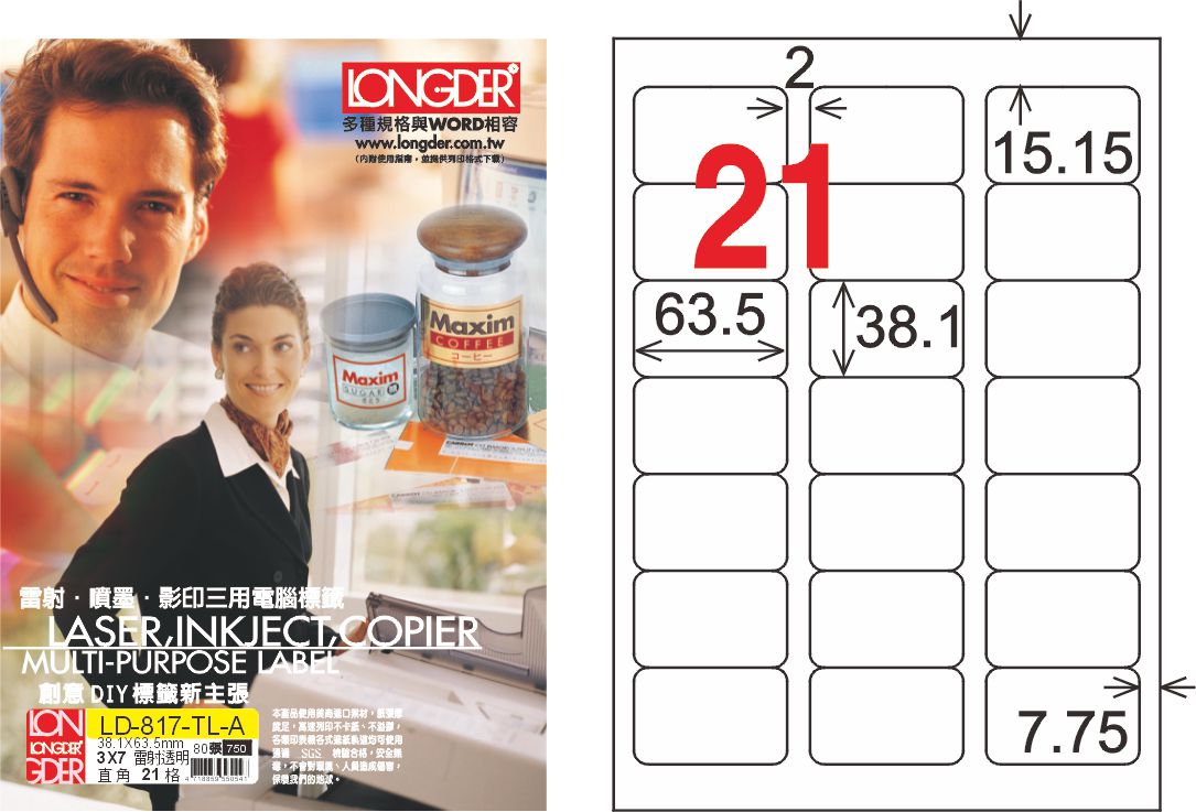 商品名稱:龍德 LD-817-TL-A A4雷射影印標籤 透明PET(可列印) / 盒