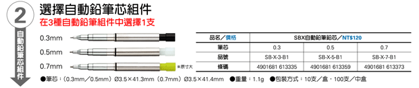 鋼珠筆、原子筆、自動鉛筆三合一,可隨意組合添換