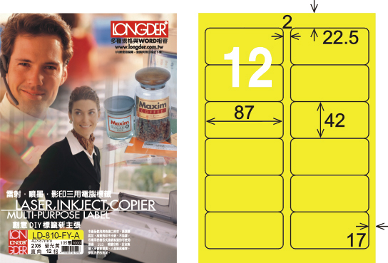 龍德 LD-810-FY-A A4雷射影印標籤 螢光黃 / 盒