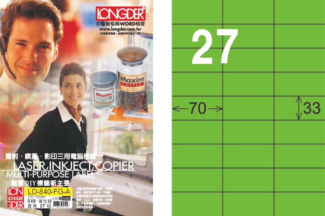 >龍德 LD-840-FG-A A4雷射影印標籤 螢光綠 / 盒