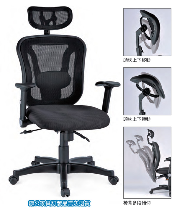 ◎特色:網背椅特點 -- 頭枕可上下移、轉動,椅背多段傾仰