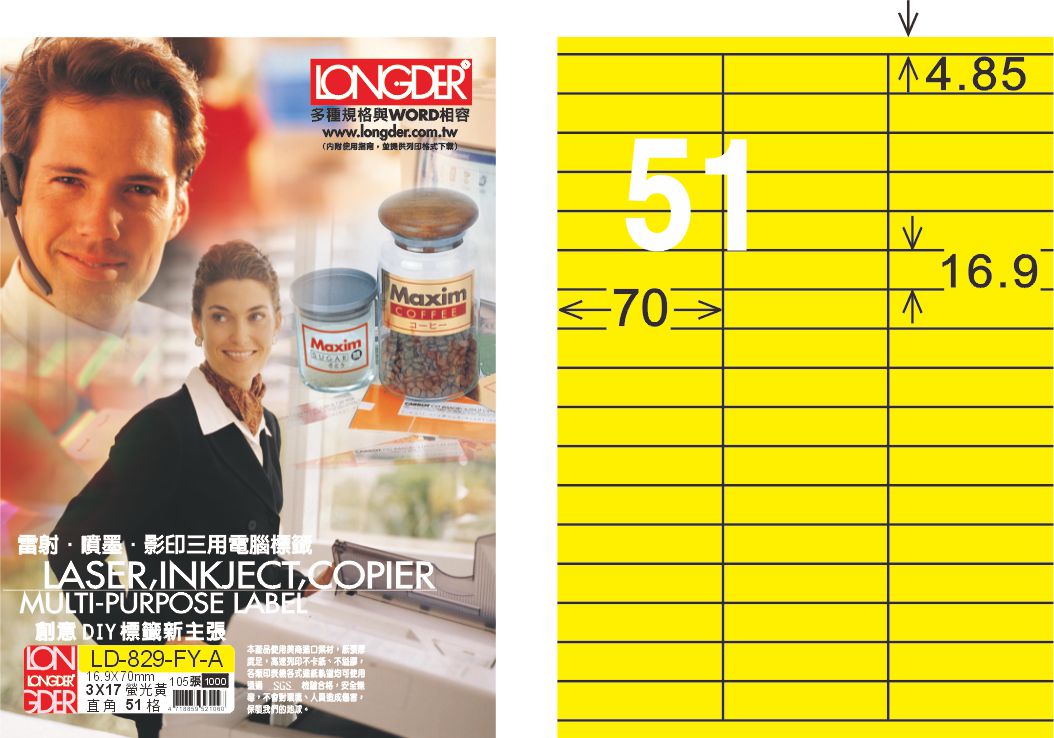 龍德 LD-829-FY-A A4雷射影印標籤 螢光黃 / 盒