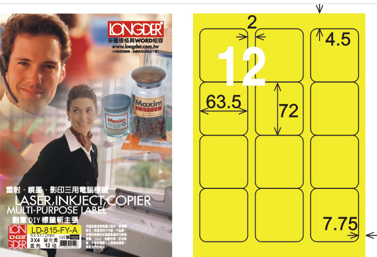 商品名稱:龍德 LD-815-FY-A A4雷射影印標籤 螢光黃 / 盒