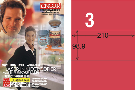 商品名稱:龍德 LD-807-FR-A A4雷射影印標籤 螢光紅 / 盒