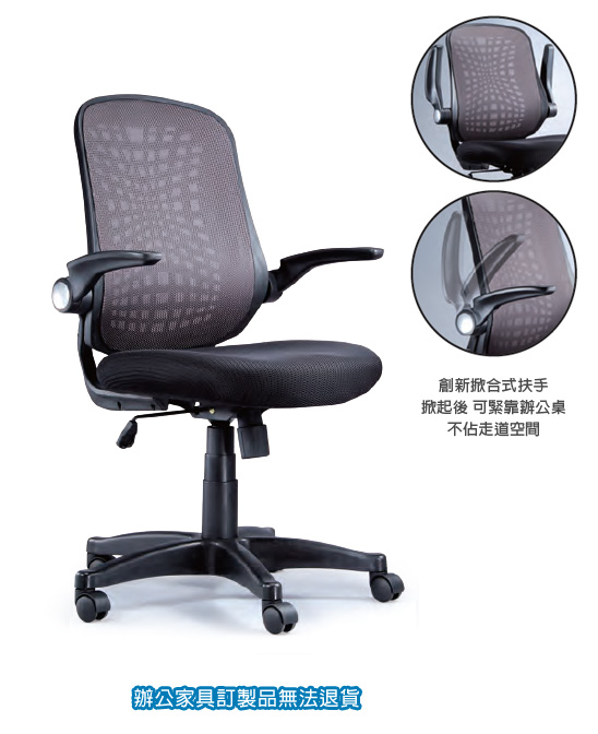 ◎特色:創新掀合式扶手,掀起後可緊靠辦公桌,不佔走道空間