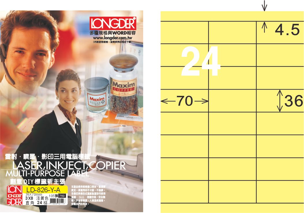 商品名稱:龍德 LD-826-Y-A A4三用電腦標籤 淺黃色 / 盒