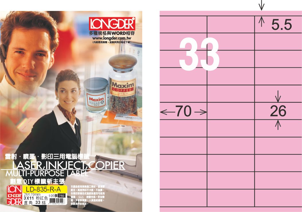 商品名稱:龍德 LD-835-R-A A4三用電腦標籤 粉紅色 / 盒
