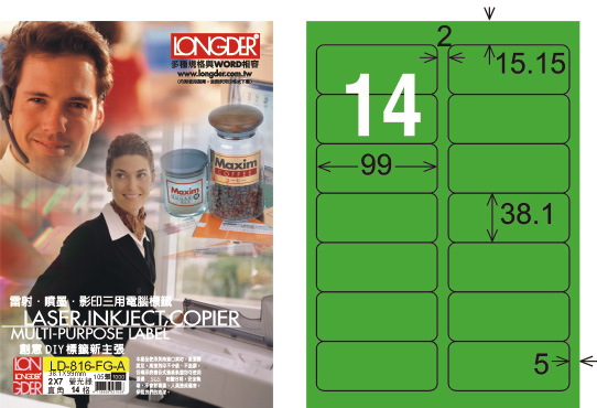 商品名稱:龍德 LD-816-FG-A A4雷射影印標籤 螢光綠 / 盒
