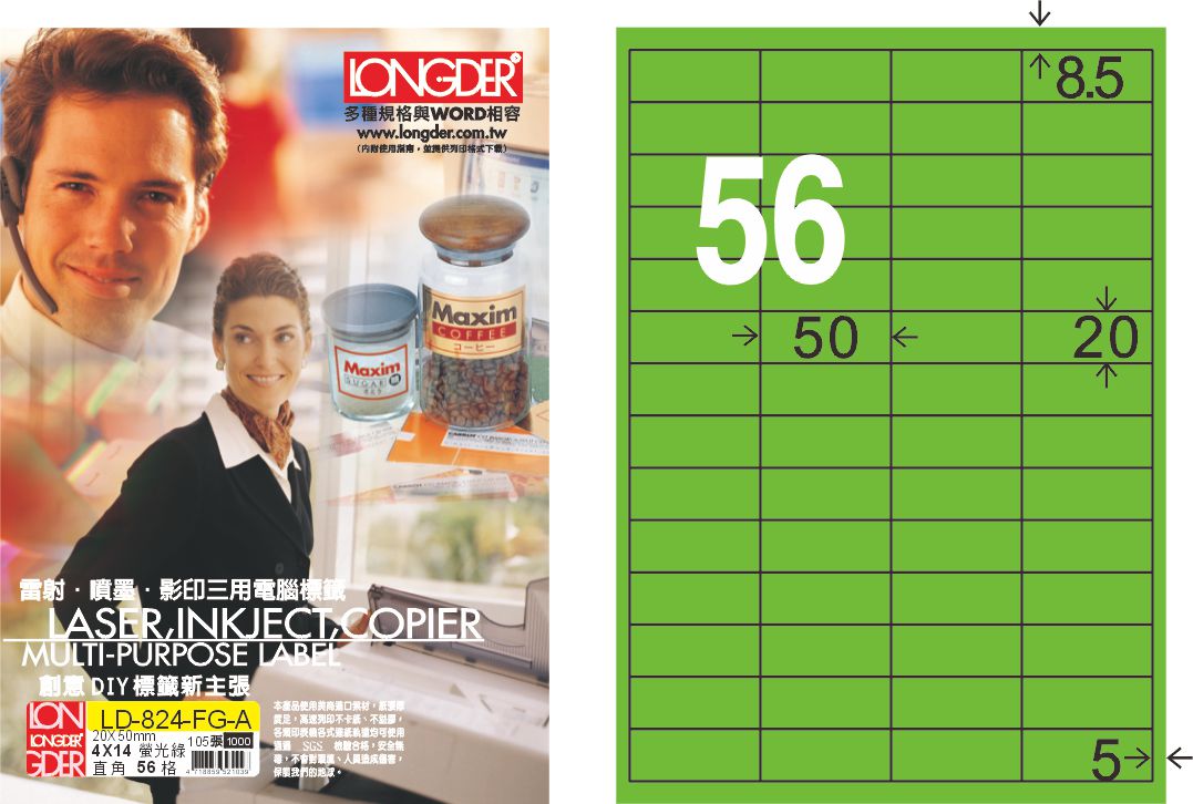 商品名稱:龍德 LD-824-FG-A A4雷射影印標籤 螢光綠 / 盒