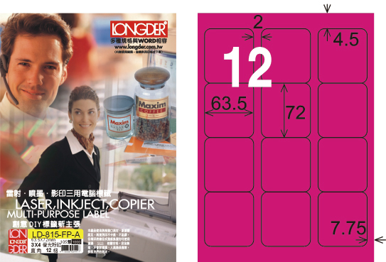 商品名稱:龍德 LD-815-FP-A A4雷射影印標籤 螢光粉紅 / 盒