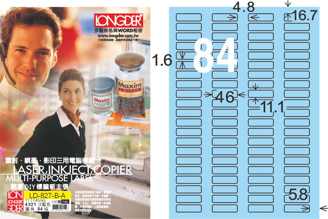 商品名稱:龍德 LD-827-B-A A4三用電腦標籤 淺藍色 / 盒