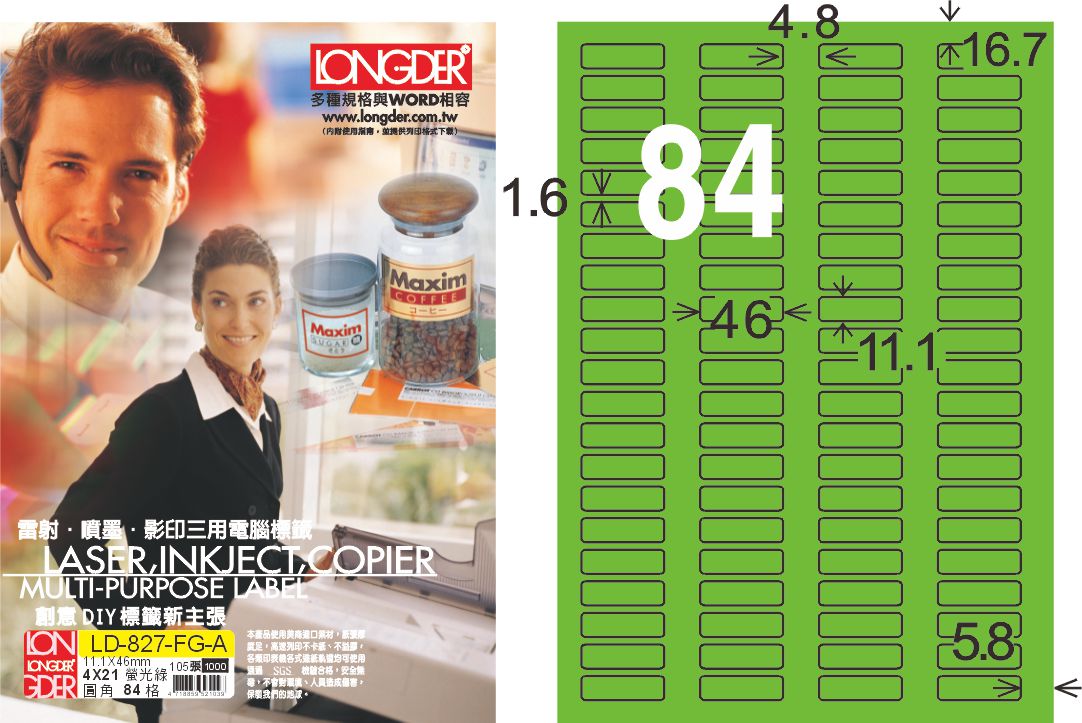 商品名稱:龍德 LD-827-FG-A A4雷射影印標籤 螢光綠 / 盒