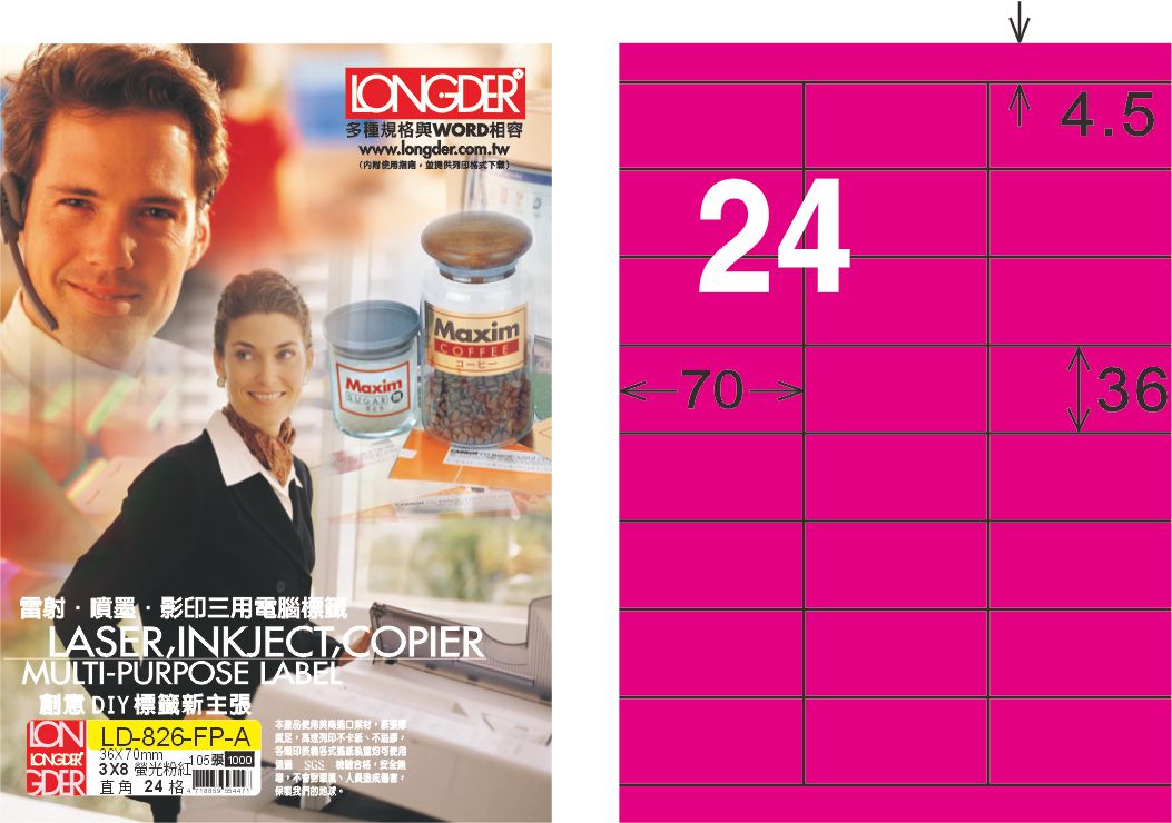 商品名稱:龍德 LD-826-FP-A A4雷射影印標籤 螢光粉紅 / 盒