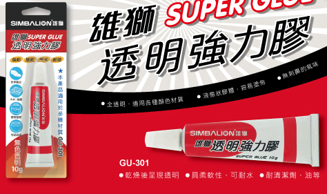 產品用途 :無刺鼻氣味的【雄獅透明強力膠】,乾燥之後呈現透明狀,適用於各種顏色的材質上,讓修繕、修補後的痕跡不易被發現。 「液狀」的【雄獅透明強力膠】容易薄而均勻塗抹於接著材質表面上,並滲透到縫隙裡,適量使用後按壓即可固定接合,讓您輕鬆完成家居修繕、手工藝品、美術勞作及汽車修理