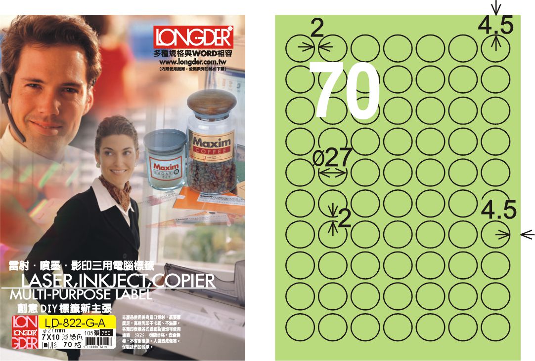 商品名稱:龍德 LD-822-G-A A4三用電腦標籤 淺綠色 / 盒