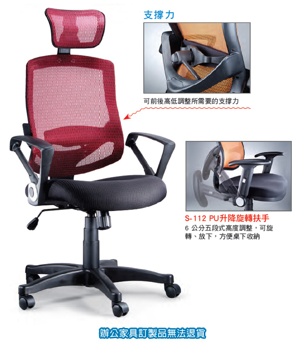 ◎特色:PU升降旋轉扶手 -- 6 公分五段式高度調整,可旋轉、放下,方便桌下收納