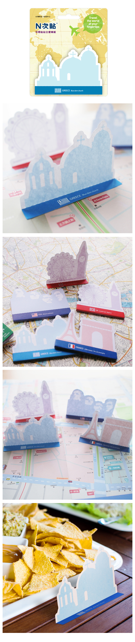 ◎品 名:N次貼 61156 可站立可再貼便條紙,希臘 70x96mm◎單 位:30張/本◎型 號:61156◎規 格:70x96mm,希臘◎特 色:獨家專利設計,可90°站立於桌面,不僅省空間,訊息更不漏接! 6款世界知名地標,環遊世界就在彈指間!