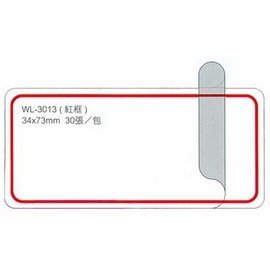 商品名稱:【華麗牌】WL-3013 紅框保護膜標籤(34x73mm) 30張/包商品單位:包商品型號:WL-3013商品特色: 白底紅框保護膜標籤適用黏貼在紙張或塑膠表面文件檔案夾/索引/商品標示/規格/分類等各種標示黏貼之用