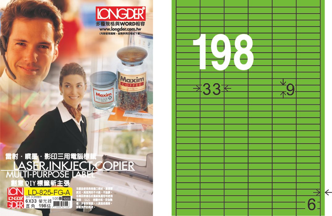 商品名稱:龍德 LD-825-FG-A A4雷射影印標籤 螢光綠 / 盒