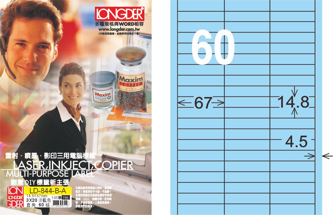 商品名稱:龍德 LD-844-B-A A4三用電腦標籤 淺藍色 / 盒