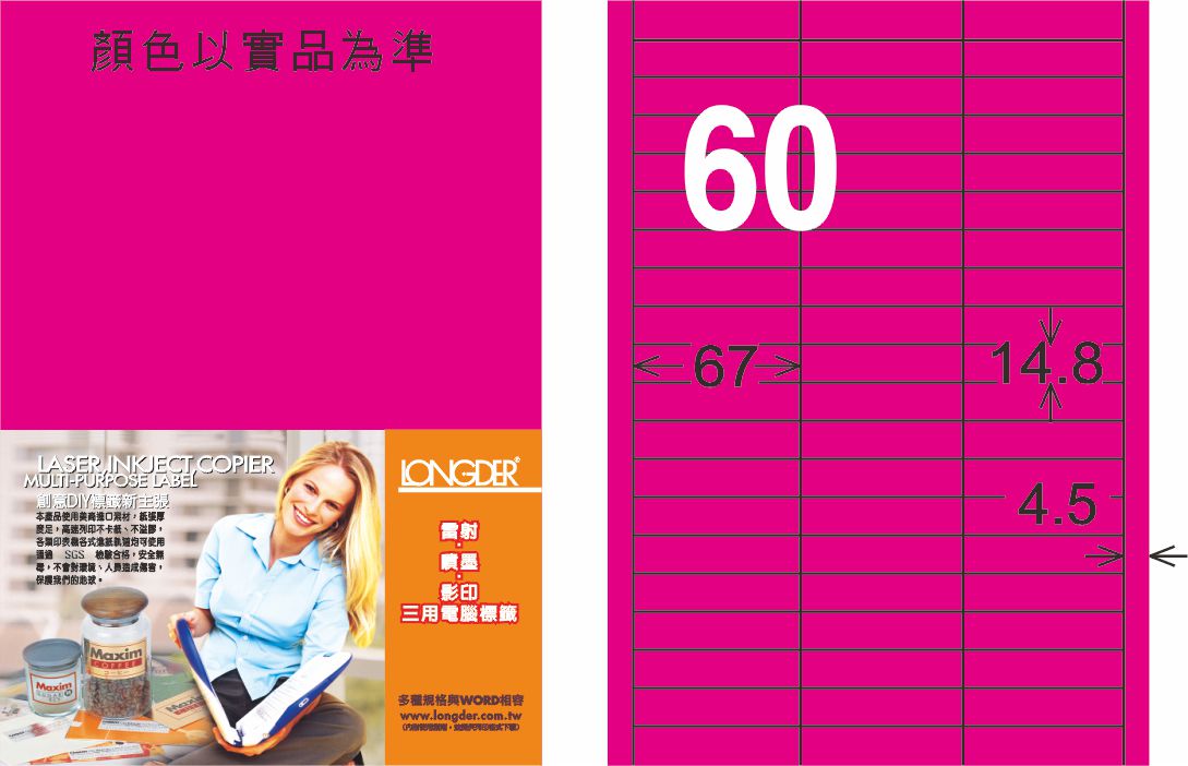 商品名稱:龍德 LD-844-FP-C A4雷射影印標籤 螢光粉紅 / 包