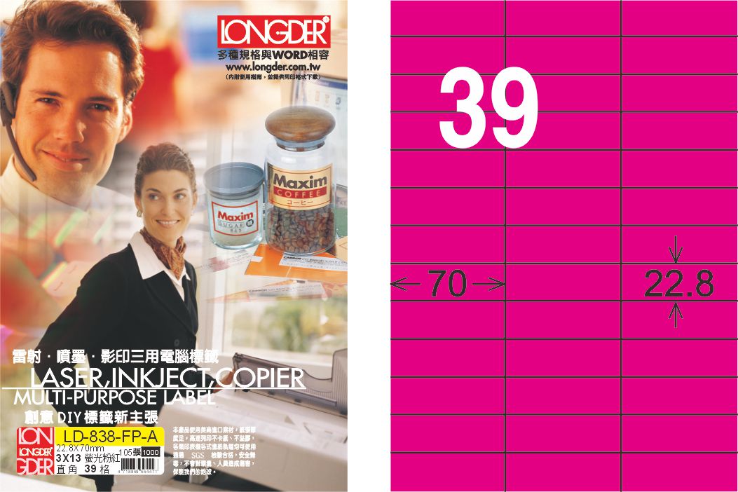 商品名稱:龍德 LD-838-FP-A A4雷射影印標籤 螢光粉紅 / 盒
