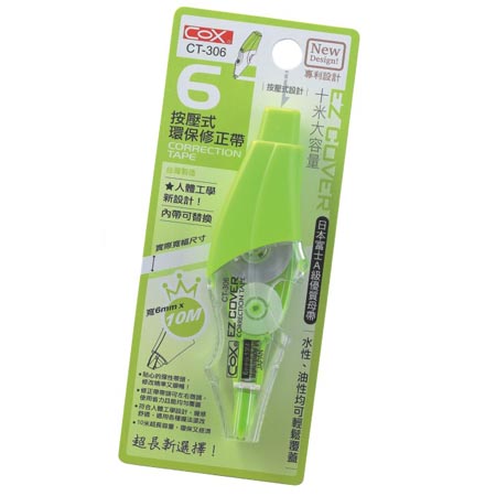| 單位:支 100%全程台灣生產製造 ★ 掀蓋式一體成型設計,替換內帶更容易。 ★ 水性、油性、影印、傳真均可輕鬆覆蓋作修正。 ★ 修正後可立即書寫,塗改位置平坦,修改位置不易刮傷修正帶。 ★ 貼新的彈性帶頭設計,可左右微調,修改精準、省力、順暢,能均勻覆蓋。 ※內帶用完可替換,可選購COX_CT-304R/CT-305R/CT-306R內帶作替換, CT-304R/CT-305R/CT-306R可以3種尺寸內帶都可裝於10米機殼作使用,任意選擇搭配,經濟又環保! ★ 可替換式內帶,內帯用完可保留機身,替換內帶環保又經濟。 | |