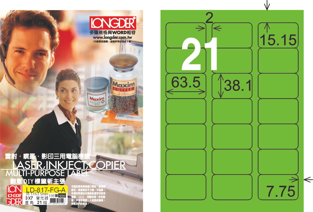 商品名稱:龍德 LD-817-FG-A A4雷射影印標籤 螢光綠 / 盒
