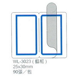 商品名稱:【華麗牌】WL-3023 藍框保護膜標籤(25x30mm) 90張/包商品單位:包商品型號:WL-3023商品特色: 白底藍框保護膜標籤 適用黏貼在紙張或塑膠表面文件檔案夾/索引/商品標示/規格/分類等各種標示黏貼之用
