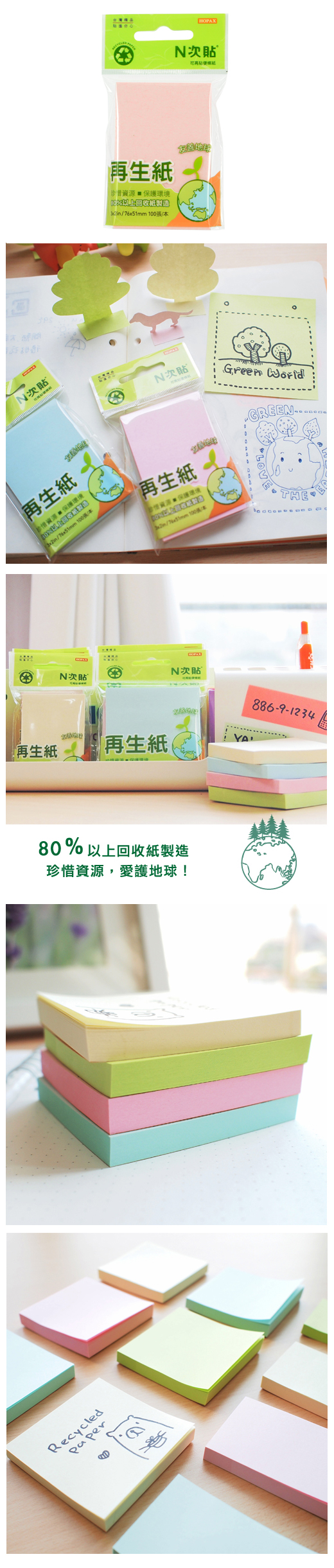 ◎品 名:N次貼 61905 再生紙可再貼便條紙 3"x2"(76x51mm)粉紅◎單 位:100張/本◎型 號:61905◎規 格:3"x2"(76x51mm)◎顏 色:粉紅◎特 色:保護環境,珍惜資源 N次貼環保系列-再生紙便條紙 80%以上回收紙製造,珍惜資源,愛護地球!