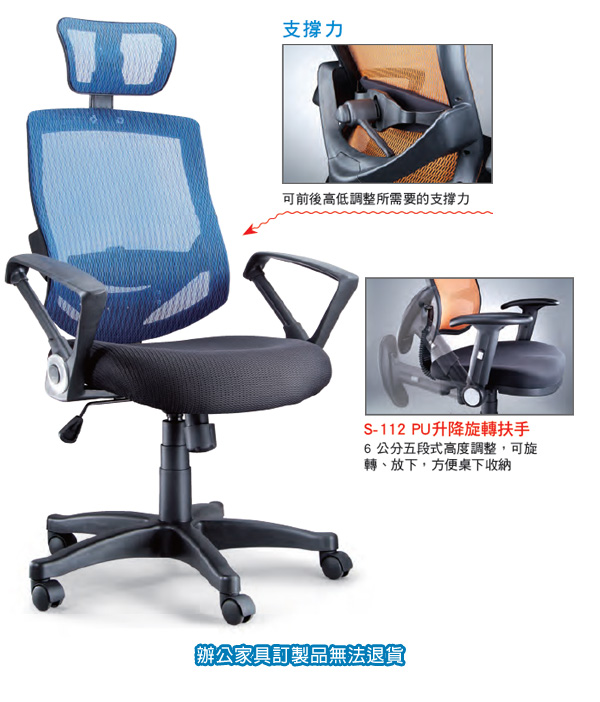 ◎特色:PU升降旋轉扶手 -- 6 公分五段式高度調整,可旋轉、放下,方便桌下收納