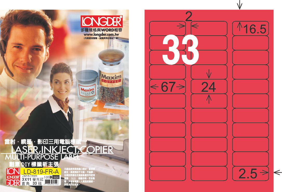商品名稱:龍德 LD-819-FR-A A4雷射影印標籤 螢光紅 / 盒