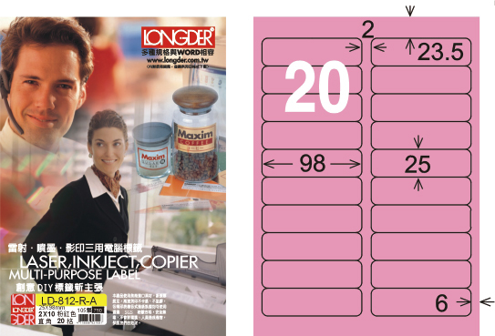 商品名稱:龍德 LD-812-R-A A4三用電腦標籤 粉紅色 / 盒