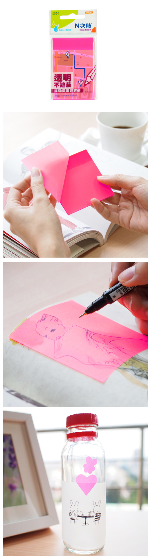 ◎品 名:N次貼 66539 透明型可再貼便條 3"x2"(76x51mm),洋紅◎單 位:50張/本◎型 號:66539◎規 格:3"x2"(76x51mm)◎顏 色:洋紅◎特 色:半透明材質,可用來描圖、標記!張張可再貼,使用超方便! 鉛筆、原子筆、簽字筆都能輕鬆書寫!比一般紙張更耐用,潑水也不怕!