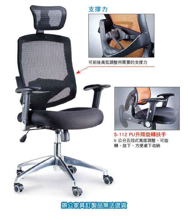 ◎品名:特級網布系列 LV-988AH 黑色 S-112 PU扶手+高鋁合金椅腳