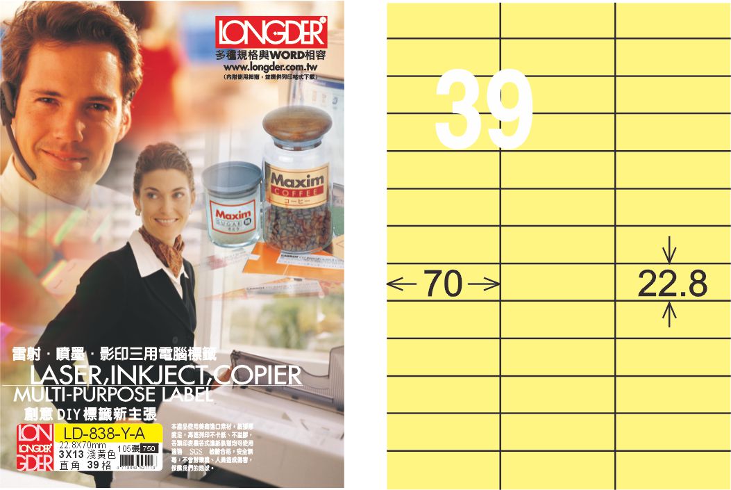 商品名稱:龍德 LD-838-Y-A A4三用電腦標籤 淺黃色 / 盒