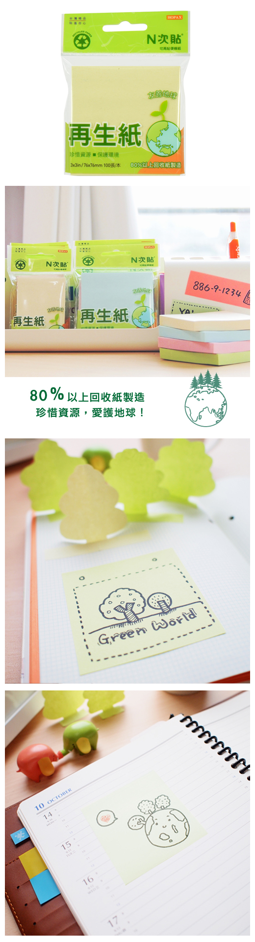 ◎品 名:N次貼 61908 再生紙可再貼便條紙 3"x3"(76x76mm)黃◎單 位:100張/本◎型 號:61908◎規 格:3"x3"(76x76mm)◎顏 色:黃◎特 色:保護環境,珍惜資源 N次貼環保系列-再生紙便條紙 80%以上回收紙製造,珍惜資源,愛護地球!