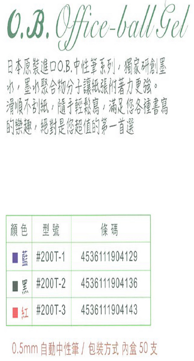 >O.B. Office-ball gel自動中性筆 0.5mm (50支/盒) OB#200T